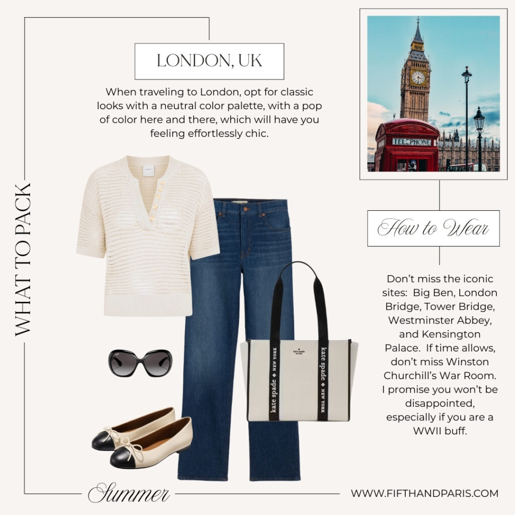This outfit embodies the relaxed elegance of London’s brunch culture while being versatile enough for last-minute shopping or exploring any neighborhoods you might have missed.